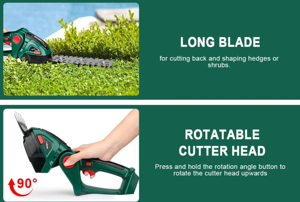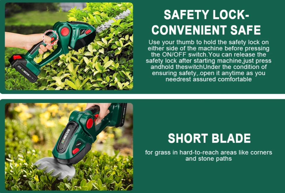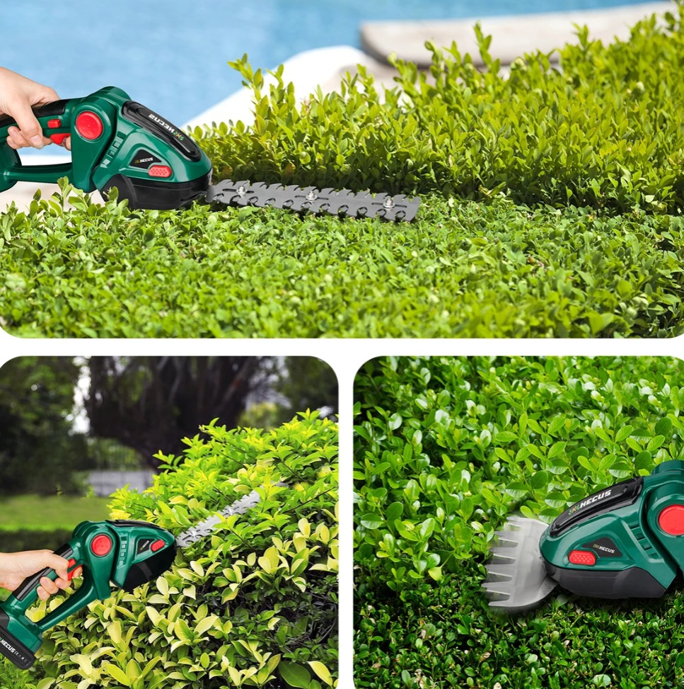 - Pode ser usado para aparar sebes, arbustos e espinhos, bem como cortar o gramado.
