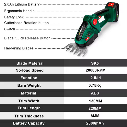 - Equipado com duas lâminas diferentes, pode ser substituído com facilidade e segurança sem ferramentas. Atenda às diferentes necessidades do seu jardim.