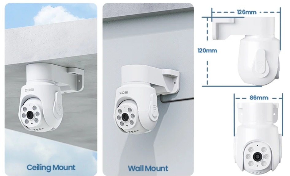 Mini design, com suporte para montagem no teto e na parede, perfeito para uma variedade de cenários de segurança doméstica.