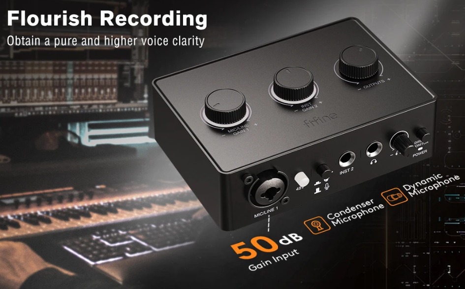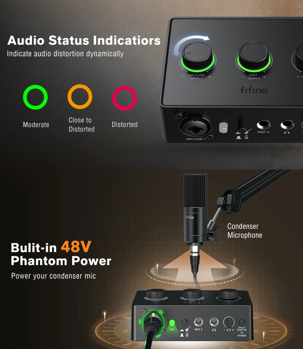 Mesa misturas 48V FIFINE para microfone XLR Podcast Mac e PC