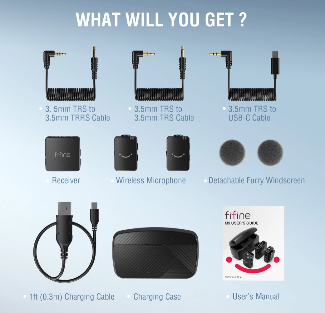 • Microfone lapela duplo sem fio FIFINE M9 transmissão até 200metros autonomia bateria 7horas compatível com iPhone Android câmeras laptop